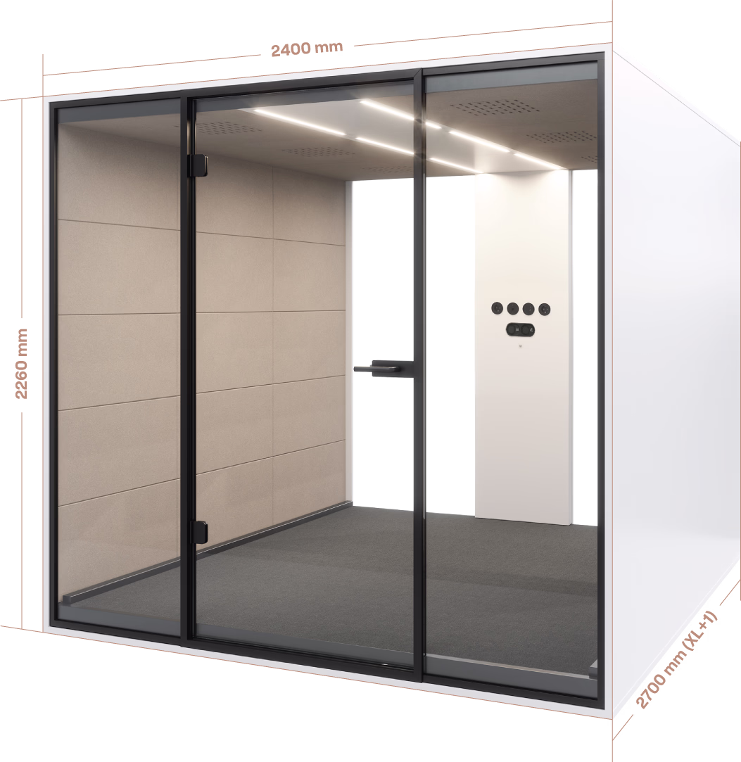 A modern, modular meeting booth designed for up to 10 people, with the flexibility to extend as needed. Its spacious and timeless design seamlessly integrates into any office landscape. In Box XL, you can hold meetings and video conferences in a protected and private environment. This versatile booth is space-saving and can be customized to accommodate the demands of modern collaborative projects, allowing you to expand it as your needs grow. BoxXL features a unique modular design, allowing you to start with a spacious basic booth and add segments (90 cm each) for tailored solutions.