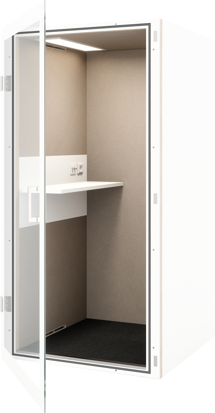 The Cube 1 Stand is a stylish acoustic phone booth that blends an elegant biophilic design with superior sound insulation. Inside, a premium wool felt interior and wooden accents create a private, natural retreat for focused work. This booth is the perfect solution for offices seeking a calm, ergonomic space that promotes well-being and productivity.